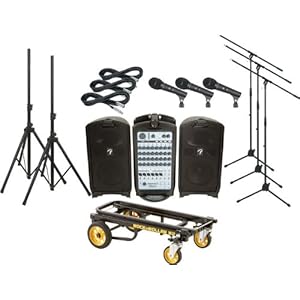 Includes the Fender Passport 500 PRO portable PA system; 3 Audio-Technica M4000S hand-held dynamic mics; 3 MS-220 tripod mic stands with fixed boom; 3 XLR mic cables (20'); 2 standard speaker stands; and 1 Rock N Roller R2RT (Micro) Multi-Cart 8-in-1 Equipment Transporter.Fender Passport 500 PRO:The 8-channel Fender Passport 500 PRO Portable PA system is Fender's most powerful portable PA system and offers the greatest clarity. Fender has added an input for recording your performances with CD-quality (WAV) straight to a USB flash drive. The Passport 500 also offers CD-quality WAV and MP3 playback, and a sub-out jack has been added for an external powered subwoofer.This Pro 500 is also 9 pounds lighter than the previous version with reduced, more portable dimensions. The redesigned speaker system features two molded plastic cabinets with a 10" woofer and a 1.2" horn-loaded tweeter in each to deliver better definition than before. When not in use, the speaker clips to the mixer for a convenient, one-piece portable system.Take a close look and listen and the Passport PRO 500 will take you places like never before. Fender kept the best of previous Passport generations and added new features and functionality so that this Passport system is ideal for whatever your PA application may beeducation and presentations, party gigs, small clubs, and coffee houses. It even gives you two ways to record: The first is a Stereo Out that allows you to hook it up to a recording device without it being affected by master volume changes. The second is a USB recorder that lets you insert a USB memory stick or flash drive. This drive can also be used for playback.Audio-Technica M4000S:The handheld Audio-Technica M4000S dynamic microphone combines professional features with a ridiculously affordable price tag. Audio-Technica tailors the M4000S mic's frequency response for crystal-clear vocal reproduction. Great feedback rejection and focused pickup are due to the A-T microphone's unidirecti