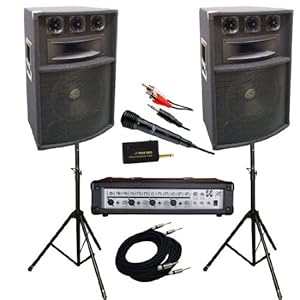 - 4 Channel Powered PA Mixer/Amplifier To Power Included Speakers - 4 Balanced Microphone Inputs with Phantom Power. - 4 x 1/4' Line/High Impedance Input. - Tape/CD/Laptop/Ipod Line Inputs - Built-In Reverb with Individual Control - Volume/Equalizer/Master Control - EFFX Control with Echo - Line Audio RCA Output - (Qty 2) 600 Watt 12'' Three-Way PA Speaker Cabinet - Heavy Duty MDF Construction w/Reinforced Corners - 5''x 12'' Super Horn Midrange/Tweeter / - 1'' Titanium Compression Driver Loaded in Horn - Power Handling: 300 Watts RMS/600 Watts Peak - Frequency Response: 50-20K HZ - Sensitivity (1w/1m): 98 dB - Impedance: 8 Ohms - Speaker Weight: 50 lbs - (Qty 2 ) 6 ft. 2-Way Tripod Black Anodized Aluminum Speaker Stand w/Metal Lock - (Qty 2 ) 30ft. 12 Gauge Professional Speaker Cable 1/4'' to 1/4'' - Dual Function Wireless/Wired Microphone System w/ XLR to 1/4'' Cable included - 6ft. 3.5mm Stereo CD/MP3/Ipod Input Cable